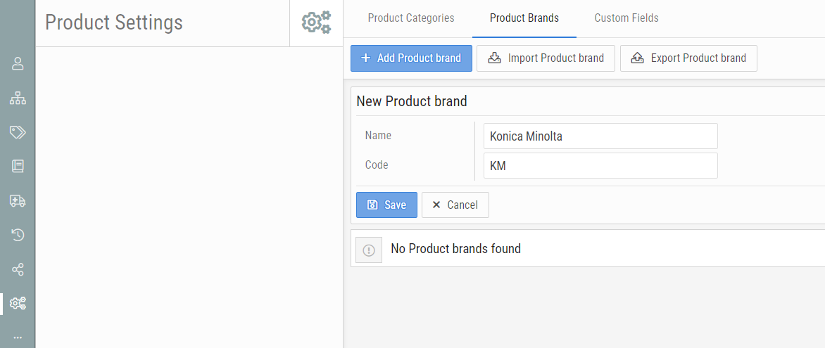 - Enter in the Product Brand Name, provide a unique Code and click Save: