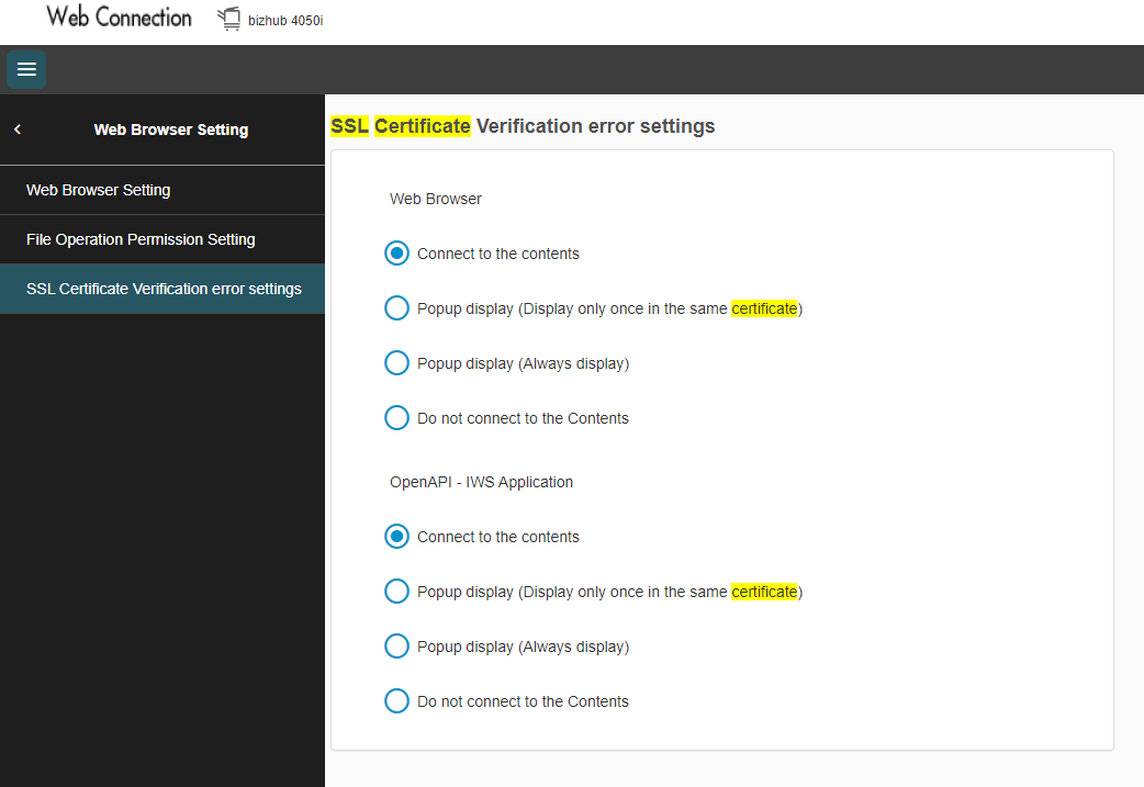 13. Navigate to 'SSL Certificate Verification error settings' under Network > Web Browser Setting. (Or search for SSL Certificate).