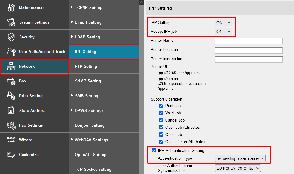 15. Ensure that IPP Setting and Accept IPP job are both set to ON.