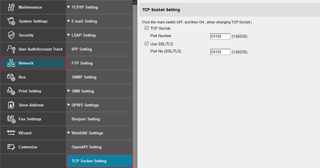 8. In the “Network” section, display the subsection “TCP Socket Setting”. Tick “Use SSL/TLS” and click “OK”. You will be asked to switch the device off and on again, however, just refresh the page.