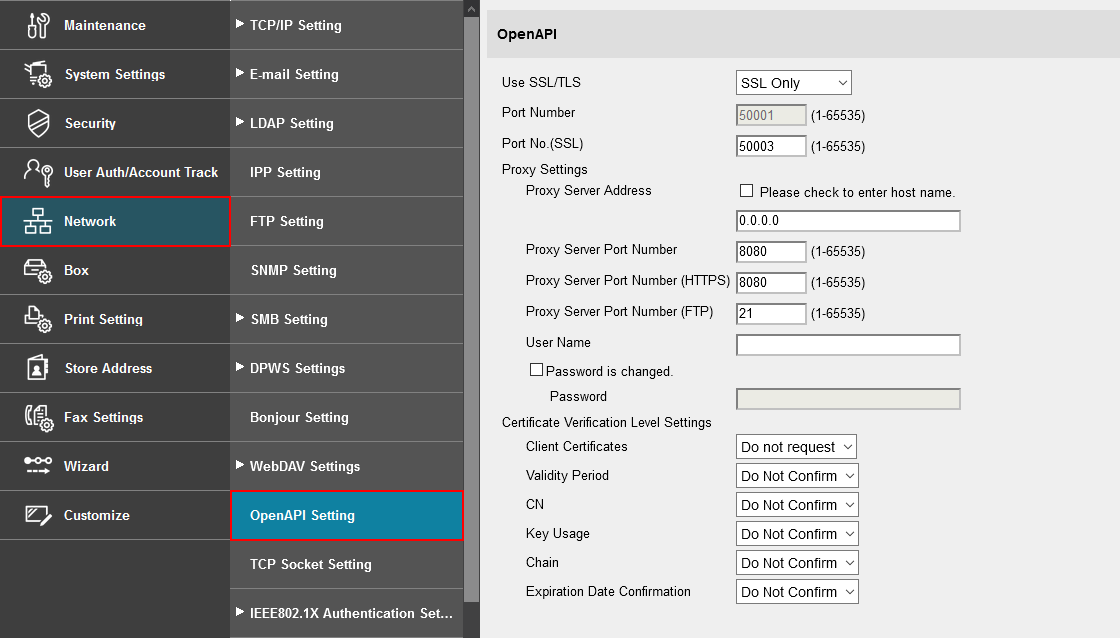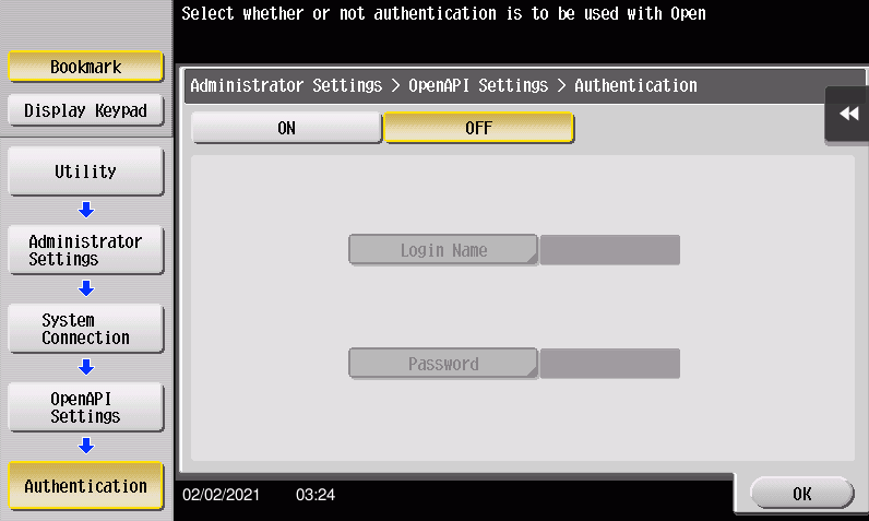 17. Some newer devices include an OpenAPI password that needs to be removed. To do so, access the administrator settings on the device’s panel, not the web interface: