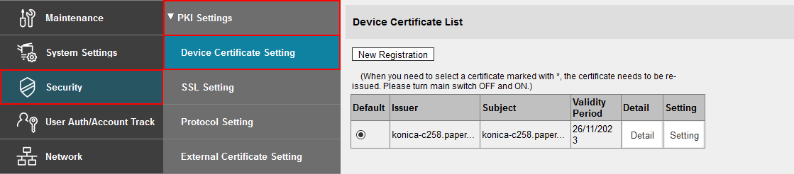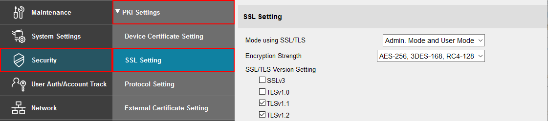 6. Log into the device web interface as administrator again. In the “Security” section display the “PKI Settings” subsection and from the menu on the left, choose “SSL Setting”. Change “Mode using SSL/TLS” to “Admin Mode” or “Admin Mode and User Mode” (on some machines: just “enable”). Your web browser will re-logon to the web server under “https” mode. You may have to confirm an “invalid certificate” in your browser.
