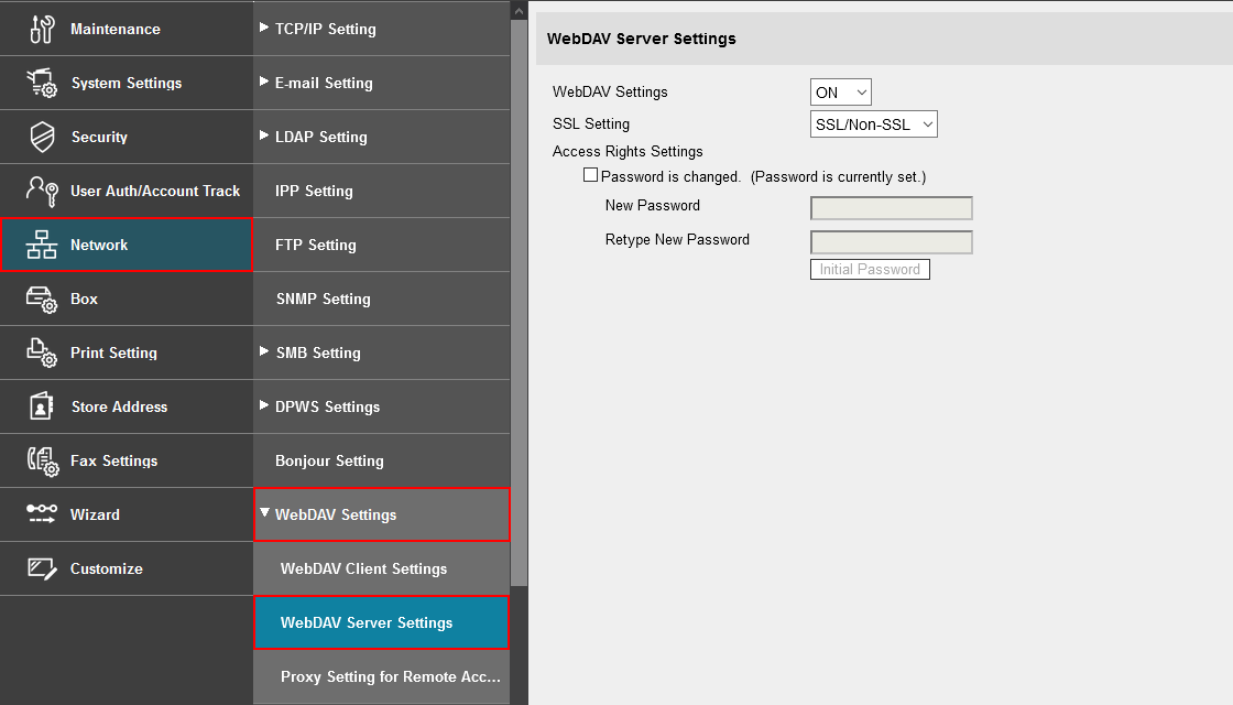 10. Within Admin Mode on the Web browser, ensure WebDAV server is enabled on the device (under Administrator Settings > WebDAV Settings > WebDAV Server Setting). Port 80 on the device will need to be accessible from the PaperCut application server in order to push out application resources over WebDAV.