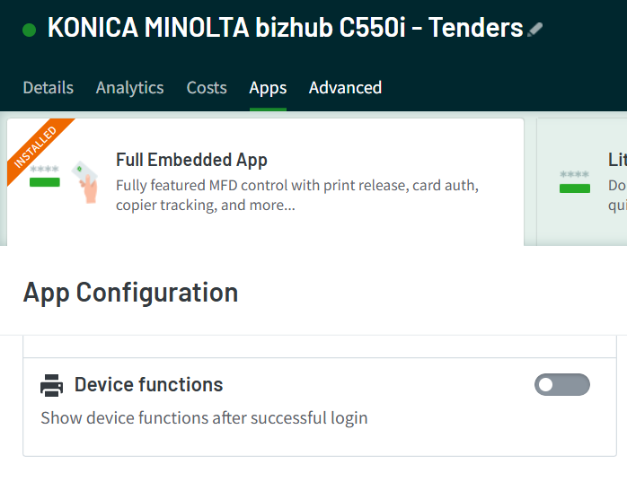 Solution: Navigate to the MFP's Apps section in the Hive portal and disable the Device Functions feature. This adjustment ensures that the PaperCut Hive app launches immediately upon user login.