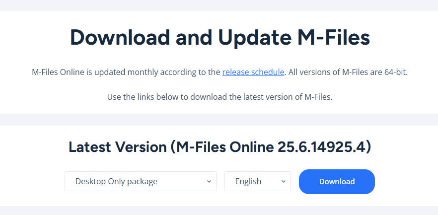 - Access the M-Files Product Centre Downloads Page and download the latest version of the Desktop Only package: