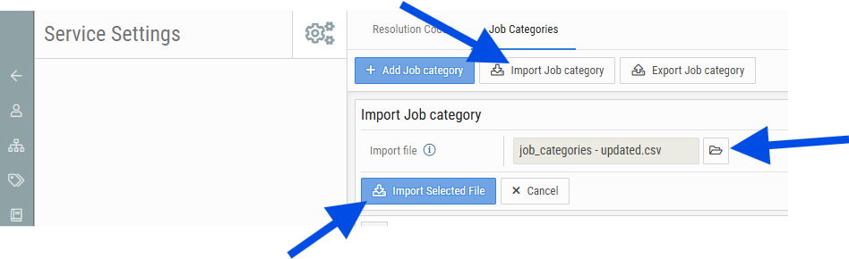 - Click on Import Job category, browse for the updated file, then select Import Selected File.