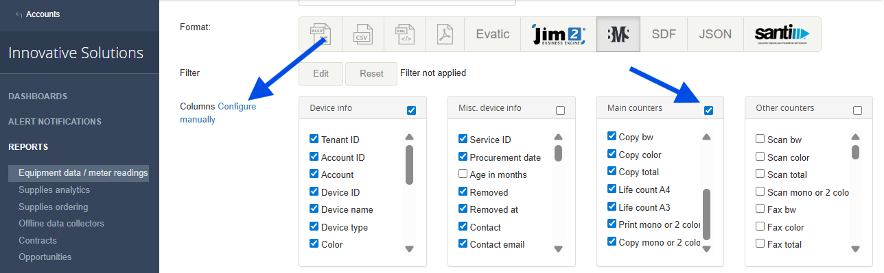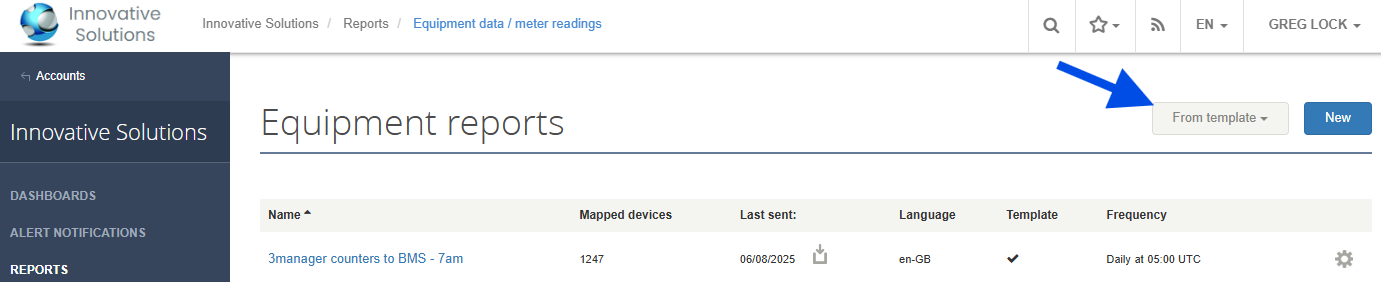 - On the Vendor's top level Reports > Equipment data / meter readings, click on From Template and select the saved template: 3manager counters to BMS - 7am