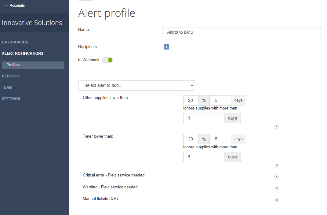 - Under Select alert to add, select the relevant alerts, one by one, to be sent to BMS. The following list is our recommendation: