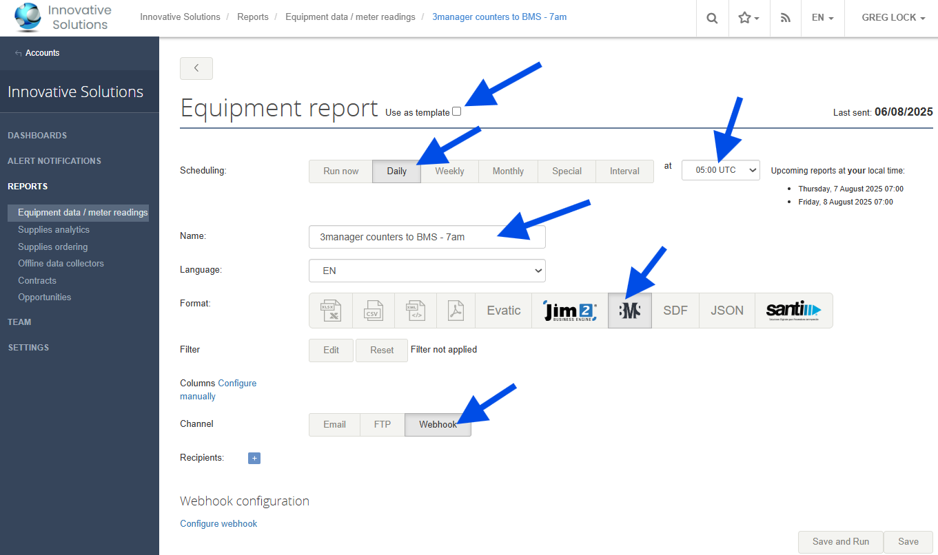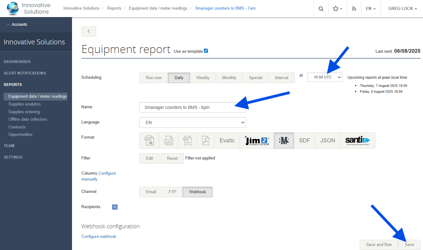 Clicking Save and Run will save the equipment report details, but then immediately runs it as well. Once configured, 3manager will prepare an equipment report, then post it via the specified webhook to the BMS Audit Service.