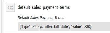 - Export the current settings, edit the value under the 'default_sales_payment_terms' field, save a copy of the YML file.